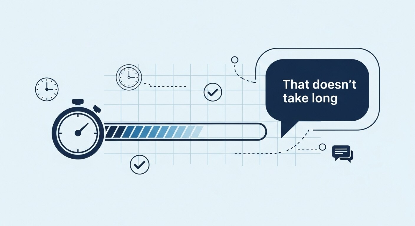 이 표현에서 실수는 주로 조동사/시제에서 납니다. “doesn’t took” 같은 형태는 절대 안 되고, doesn’t + 동사원형(take)이 기본이에요. 그리고 주어가 길어지면 오히려 쉬워집니다. “This step doesn’t take long”처럼 주어를 구체적으로 만들면, “that/it”의 모호함도 줄고 문장도 더 자연스럽습니다. 마지막으로, 일이 예상보다 길어지면 솔직하게 업데이트하는 문장도 준비해두면 좋아요.