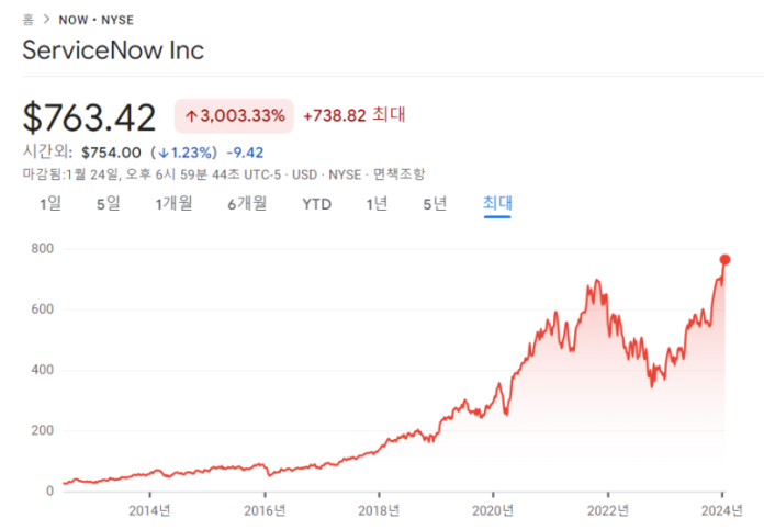 서비스나우는 IT 업무관리 소프트웨어를 개발하고 있는 미국의 기업이고, 특히 기업의 IT 관련 업무를 매뉴얼화 시켜주는 방식에 강점을 보이고 있다. 미국 내에서 관련 서비스로 무려 40% 이상의 점유율을 차지하고 있다고 한다.