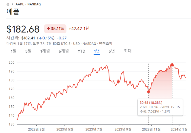 애플도 23년 10월에 저점을 보이고 연말까지 쭉죽 상승세를 타다가,