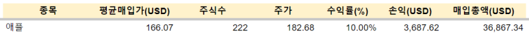 요즘 애플도 틈틈히 줍줍하면서 수량 늘어가는 재미를 느끼고 있는데, 어제도 2주 줍줍해서 222주째가 되었다. 수익률은 계속 떨어져도 수량이 늘어나고 있는게 훨씬 좋음.