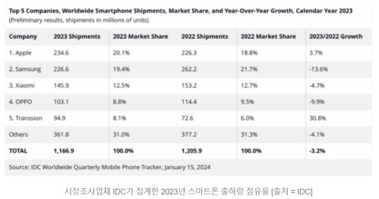 23년 출하량 기준으로 전세계 스마트폰 시장 점유율이 나왔는데 애플이 20.1%를 기록하며 1위에 등극했고, 22년 21.7%로 1위였던 삼성전자는 23년 19.4%로 떨어지며 2위를 기록했다.