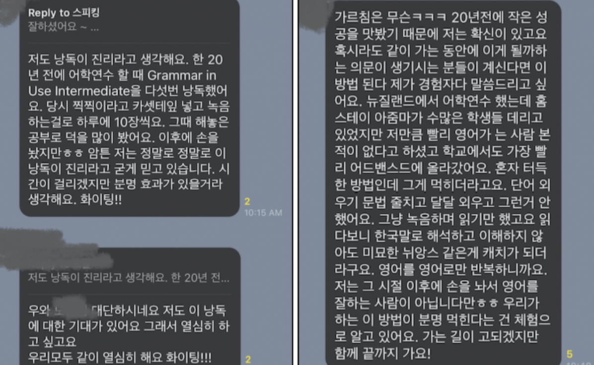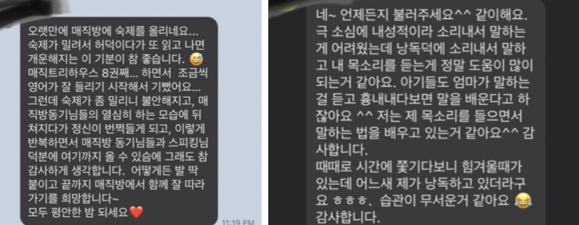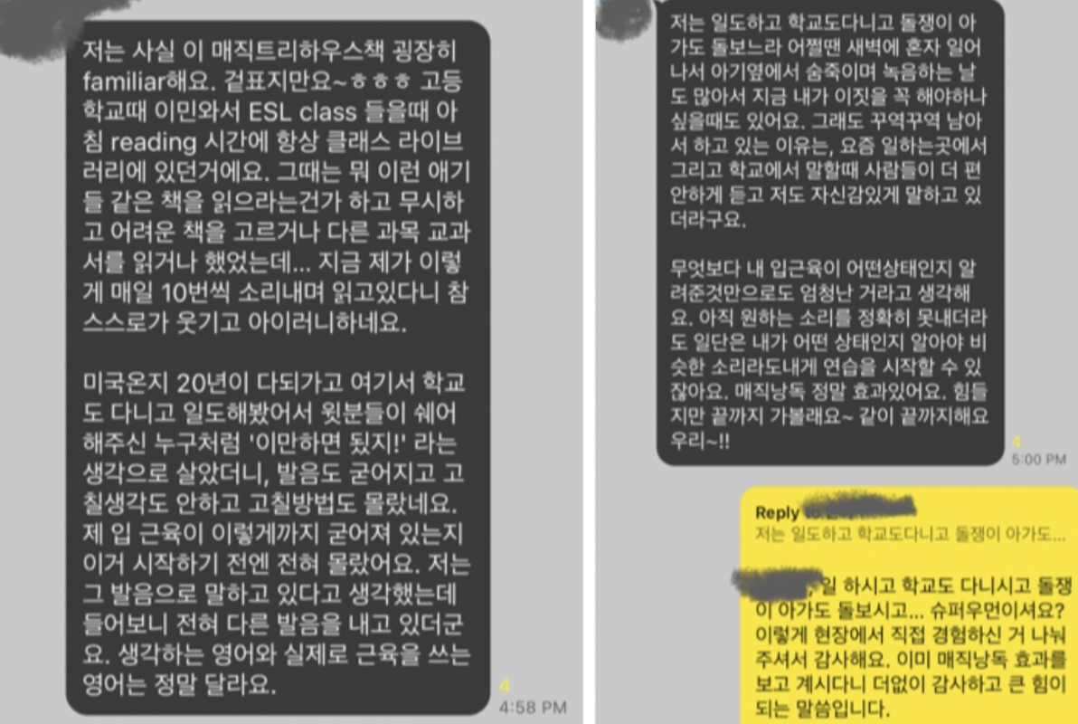 작년 9월에 시작한 매직낭독 4기가 어느새 일 년간 함께 공부하셨습니다. 매직낭독 일주년 기념 후기를 올렸으니 보시고 동기부여도 받으시길 바랍니다.