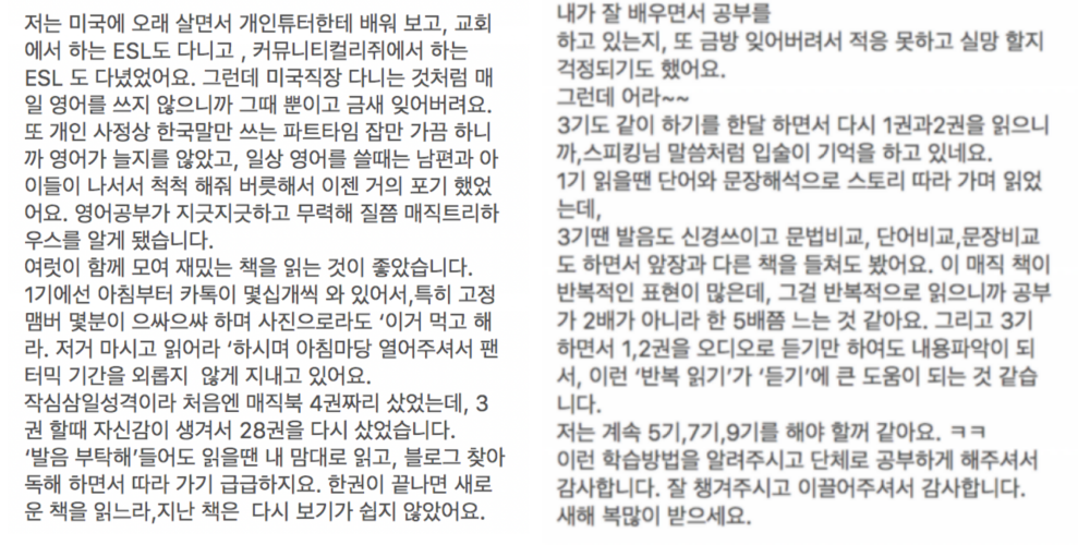 작년 9월에 시작한 매직낭독 4기가 어느새 일 년간 함께 공부하셨습니다. 매직낭독 일주년 기념 후기를 올렸으니 보시고 동기부여도 받으시길 바랍니다.