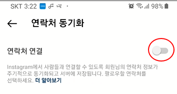 (6) 연락처 연결을 아래 이미지와 끄면 연락처가 연결이 안 되고, 다시 켜주면 인스타 연락처 동기화가 활성화됩니다.