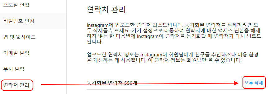 2. 동기화 된 인스타그램 연락처 동기화 데이터 한꺼번에 삭제하기