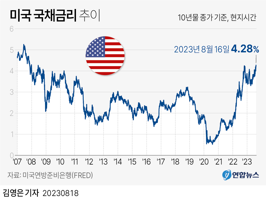 7월 FOMC 의사록 공개 이후 금리 인상 우려가 다시 부각되면서, 잭슨홀 미팅(8월 25일)의 파월 의장 발언에 관심이 확대되고 있습니다. 의사록에서 미 연준위원들이 하반기 인플레이션 리스크가 존재하기 때문에 추가 금리 인상이 필요할 수 있다는 매파적 의견을 제시했기 때문입니다. CME Fedwatch에서 9월 금리 인상 확률은 기존 10%에서 13.5%로 소폭 상승에 그쳤지만, 미 10년물 금리는 연내 최고 수준인 4.3%까지 도달했습니다. 미 재무부의 채권 발행 등 수급 요인 고려 시, 단기적으로 국채 금리가 하락할 가능성은 낮아 보입니다.