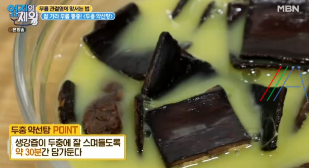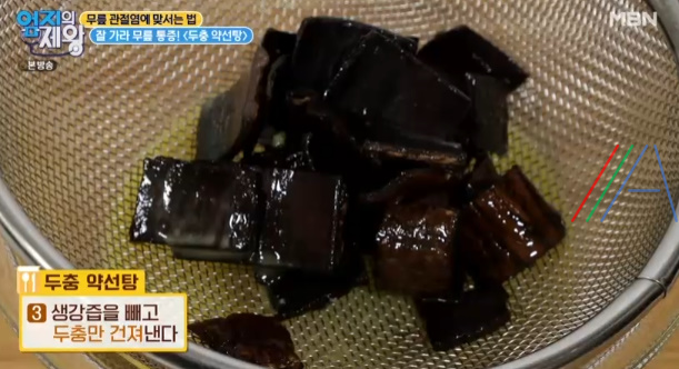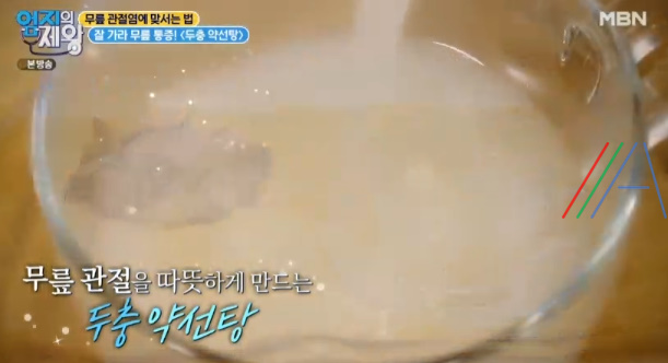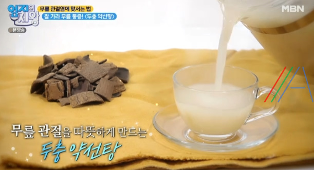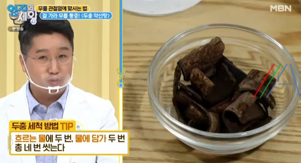엄지의 제왕> 방송에서는 ‘무릎 관절염에 맞서는 법’ 편이 방영되며, 트로트 가수 숙행과 엄지군단이 무릎 관절염의 원인과 개선 및 극복을 위한 방법들이 소개됩니다. 배한호 한의사는 두충을 이용해서 두충 약선탕 만드는 법을 알려주었어요.