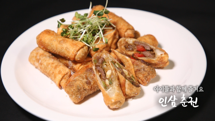 5. 완성된 인삼 소고기 잡채를 만두피에 싸서 기름에 튀겨서 아이들도 쉽게 먹을 수 있는 인삼 춘권을 완성한다.