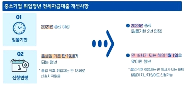 아울러 오는 12월 종료될 예정이었던 중소기업 취업 청년 전세자금 대출의 운영기한이 2023년 12월까지 2년 연장된다.