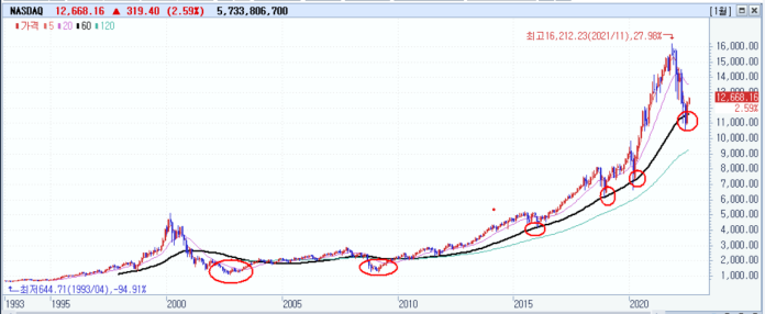 나스닥 차트를 보면 월봉기준으로 60일선 이하에서는 언제나 기회였고 또 다시 60선을 깨고 내려왔다가 반등하는 중인데 60일선이 옆으로 누우면서 다시 한번 깨질 가능성이 높고 만약 반등에 성공한다고 하더라도 매물대를 싶게 깨고 강한 상승이 나오지 않는 한 다시 하락할 가능성이 높다.