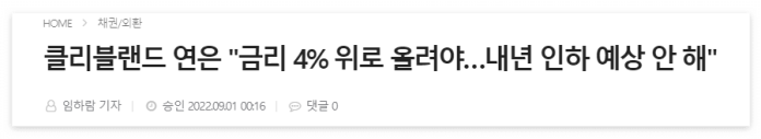 한국은 가계부채가 심각하기 때문에 금리를 쉽게 올릴 수 없지만 그래도 따라가는 모습을 보여주고 있으며 부동산은 금리 인상 및 경기 침체 우려를 반영하여 급격한 조정을 보이고 있다.