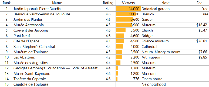 1,300종의 현지 식물을 포함해서, 약초 및 허브를 수집하는 장소로 유명하며, 현재 식물원 Jardin botanique Henri Gaussen은 다운타운 지역의 남동쪽, 미디 운하(Canal du Midi) 근처의 젊은 숙녀의 다리 지구와 가까운 Busca 지구에 있네요.