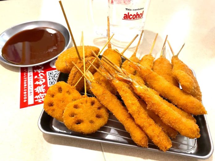 는 오사카의 대표적인 길거리 음식으로, 고기, 해산물, 채소 등을 꼬치에 꽂아 튀긴 요리입니다. 주로 돼지고기, 쇠고기, 새우, 연근 등이 사용되며, 가벼운 바삭한 튀김 옷과 함께 곁들여 지는데, 특히 곁들이는 우스터 소스와 다른 양념들로 만들어진 감칠맛 소스에 찍어 먹으면 더 맛있네요.