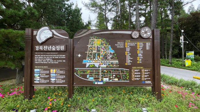 경북천년숲공원은 주차장이 비교적 넓다. 경북천년숲정원 표지석이 있는 입구로 들어가면 바로 왼쪽에 주차장이 있다. 정원 입구에는 테마별 정원과 주요 시설에 대한 안내도가 있다. 정원이 넓은 만큼 사진을 찍어 두든지 미리 숙지하면 좋다.