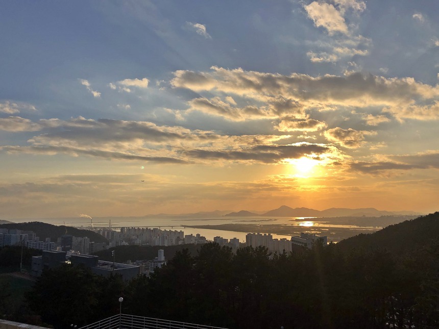 며칠 전, 동아대 하단캠퍼스에서 휴대폰으로 찍은 낙조(落照). 이환한 빛을 내며 서서히 지는 햇빛. 내일 또 뜬다하여도 지는 오늘이 아쉬울 텐데 원망도 미움도 없다. 낙동강 그 넉넉한 품처럼.