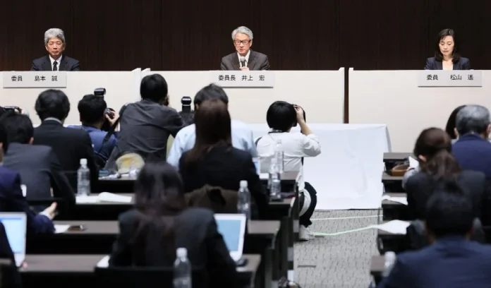 특별조사위원회 위원들이 2024년 1월 29일 도쿄에서 도요타산업의 엔진 인증 사기 관련 기자회견을 열고 있다. 도요타는 1월 29일 계열사의 테스트 부정과 연계된 엔진을 사용하는 10개 차종의 출하를 중단한다고 밝혔다.