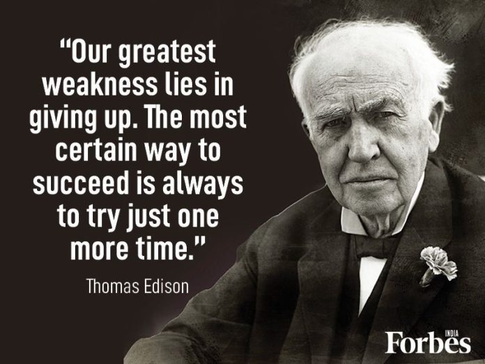 “Our greatest weakness lies in giving up. The most certain way to succeed is always to try just one more time.”