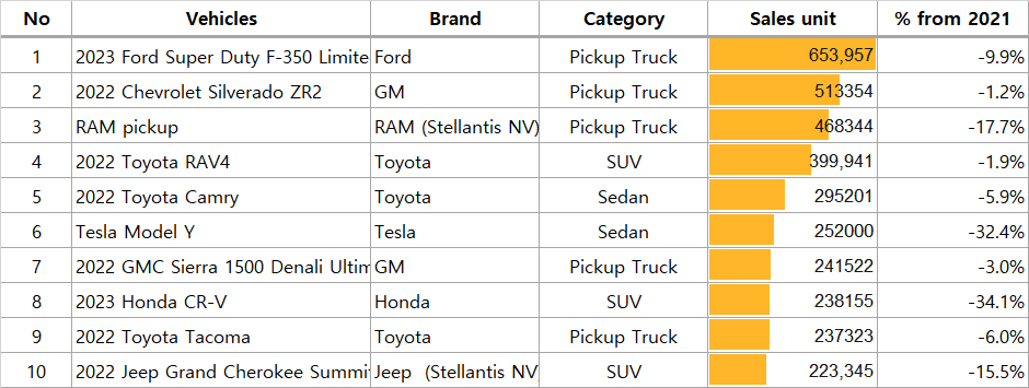 [자동차] 미국 판매 최고모델 Top10 (2022년 기준)