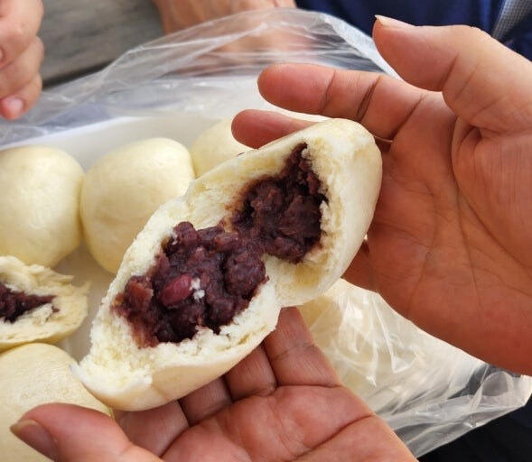 제가 방문했을 땐 오전 10시쯤이었는데 이미 박스 주문 손님들이 줄을 서 있었어요. 현장에서 바로 쪄낸 찐빵을 받아 들자마자 김이 모락모락! 차 안에서 한 입 베어무는 순간 “이래서 원조구나” 하는 감탄이 절로 나왔습니다. 팥소는 진하고 촉촉했고, 빵피는 손으로 뜯으면 탱글하게 늘어날 정도였어요.