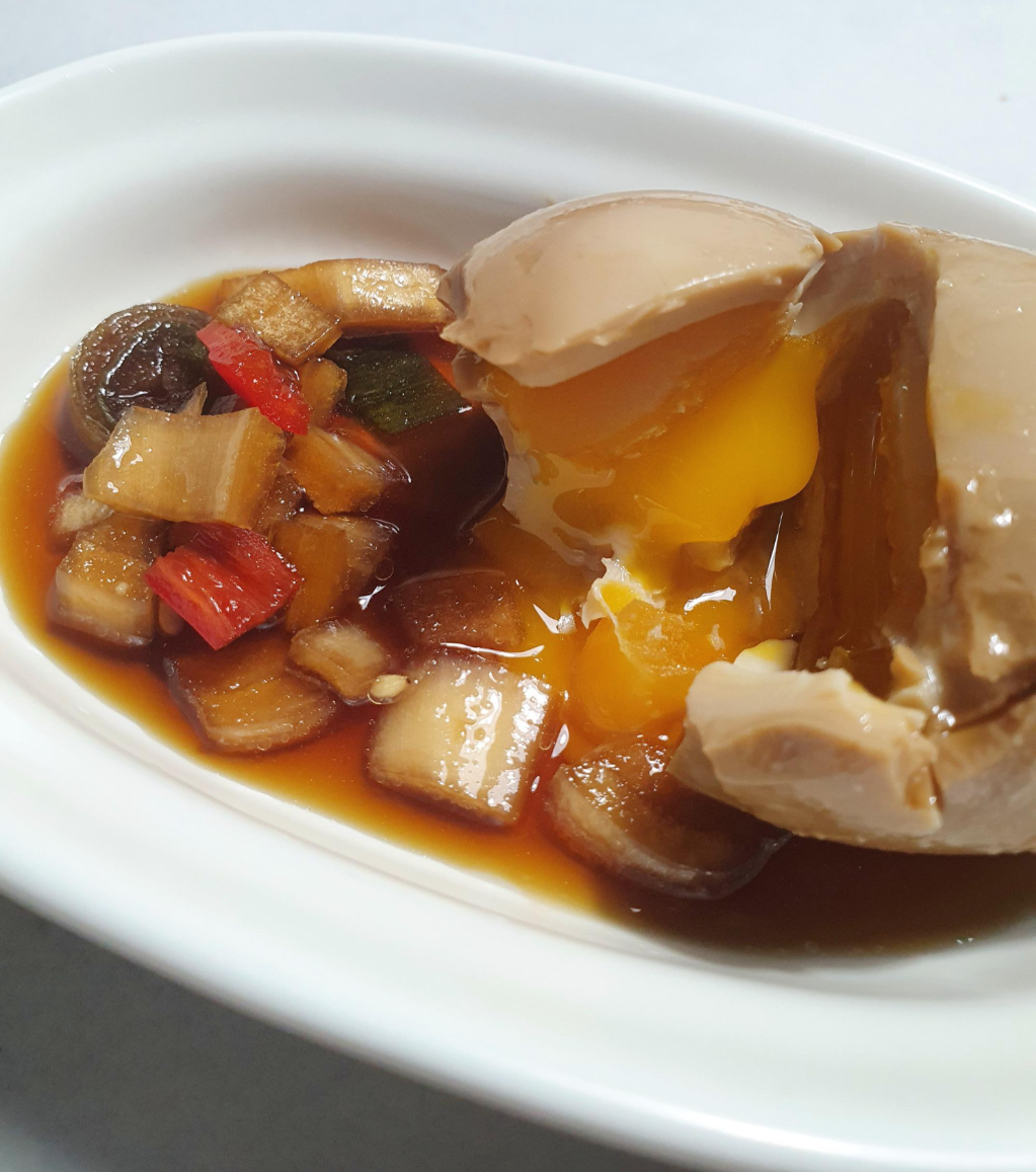계란을 반숙으로 만든 거라, 반을 가르면 노른자가 고소하게 나와서 밥에 비벼먹기 좋습니다.