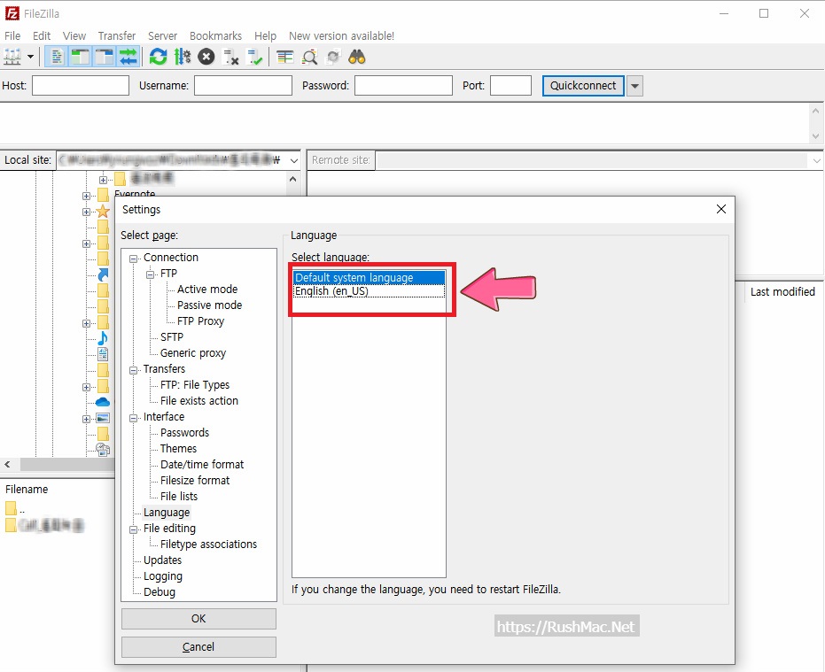 파일질라(FileZilla) FTP 프로그램 영문 – 한글 변경 방법