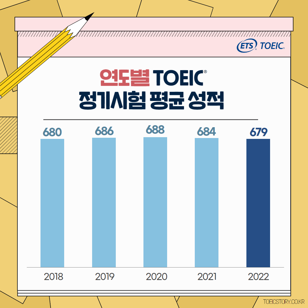 토익 정기시험 평균 점수는 2013년 636점에서 2020년에는 688점으로 꾸준히 상승하여 10년 만에 52점이 올랐다고 합니다.