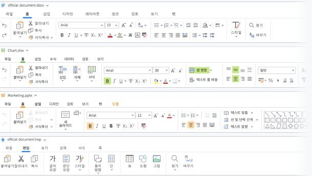 표, 그림, 도형, 글자 모양 등 쉽고 직관적인 메뉴로 편리하게 문서 보기 및 편집 가능