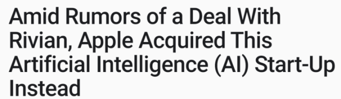 애플이 전기차 기업인 리비안을 인수하려는 루머가 있는 가운데, 애플이 요즘 집중하고 있는 AI 분야에서 스타트업을 인수하며 AI에서 어떠한 결실이 나와줄지 여러 분석이 나오고 있다.