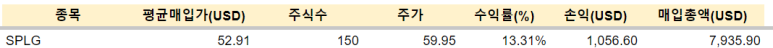 S&P500 ETF인 SPLG도 4주 줍줍해서 이제 150주째가 되었다. 앞으로도 그냥 금액 상관없이 돈생기면 1주, 2주 늘려갈 종목!
