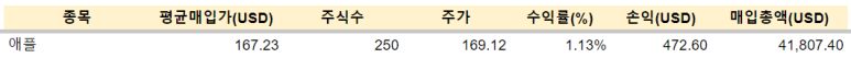 역시나 없는 시드에서 쥐어짜다보니.. 그래도 애플같은 기업은 상승세 탈때 그 화력이 더 쎄게 나타나는 편이라 싸보일때 1주라도 더 늘려두면 괜찮지 않을까 싶은 판단을 했다.