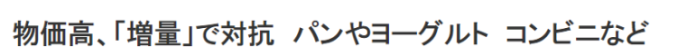물가가 높아지는 가운데 절약 지향적인 소비자를 끌어들이기 위해 일본의 대표 편의점이나 슈퍼마켓들은 판매가를 그대로 두면서 제품의 증량을 하는 캠페인을 실시중이라고 한다.