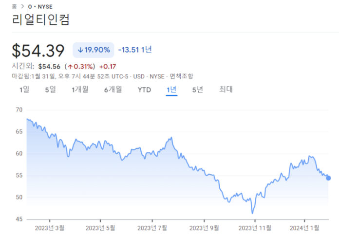 리얼티인컴은 소비자지출에 대한 우려와 경기 침체 가능성으로 인해 23년 한해동안 주가 하락세도 컸던 기업이다. 하지만, 다시금 투자자들이 최고의 리츠기업인 리얼티인컴의 뛰어난 배당 기록과 우수한 임차인 포트폴리오를 높게 평가하기 시작하고, 24년에는 금리 인하의 흐름도 올 것으로 전망이 되며 23년 말까지 반등하기도 했다.