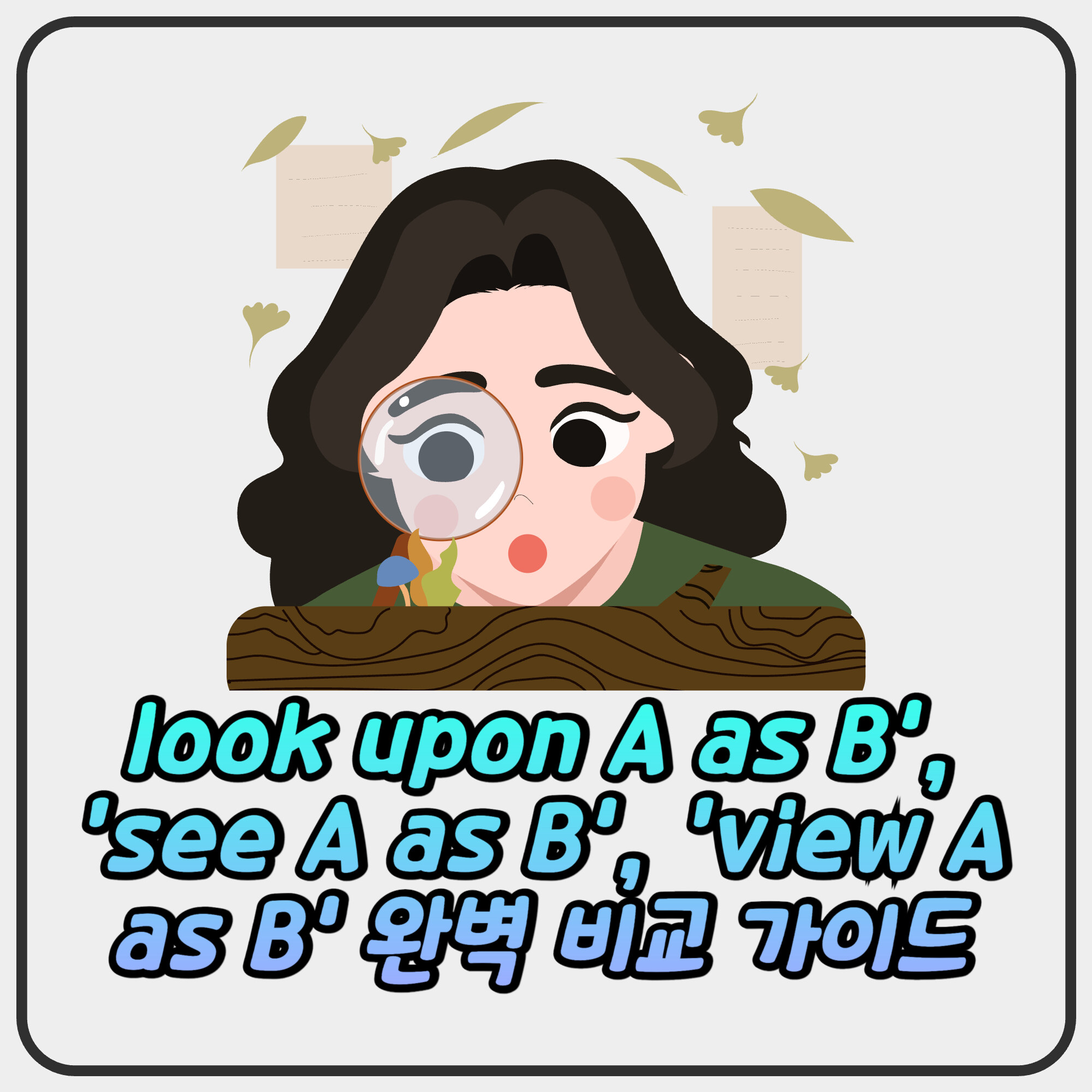 look upon A as B’, ‘see A as B’, ‘view A as B’ 완벽 비교 가이드 영어를 공부하다 보면 비슷해 보이지만 쓰임이 미묘하게 다른 표현들이 있습니다. 특히 look upon A as B, see A as B, view A as B는 모두 ‘A를 B로 여기다’라는 뜻을 가지지만, 각 동사가 내포하는 심리적 거리와 인식의 깊이가 달라집니다. 😊