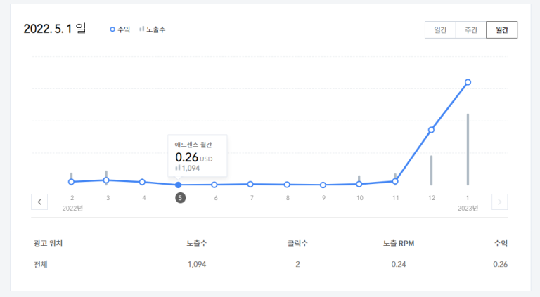 [블로그] 티스토리 블로그, 애드센스 실제수익 (2023년 1월) 개인 티스토리 애드센스 월간 수익 [블로그] 티스토리 블로그, 애드센스 실제수익 (2023년 1월) 에 대해 리뷰하려고 합니다. 티스토리 오픈한지 1년 6개월 경과하고 있고, 구글 애드센스 적용된지는 12개월 정도 됩니다. 구글 애드센스, 월간 수익 $1 수준 한달에 $50 목표로 정했었는데, 지난 2022년에 월간 기준 $1 수익도...