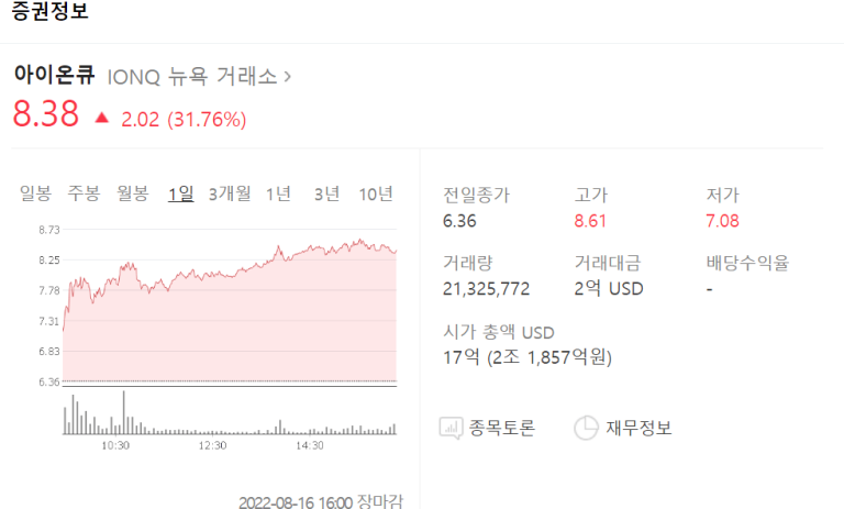 한국 투자자들 사이에 인기를 끌었던 아이온큐(IONQ)는 전날 급등세를 보였습니다. 아이온큐는 16일 하루만에 32% 올라서 8.38달러에 거래를 마쳤는데 최근 한달 주가가가 82.57% 올랐습니다. 아이온큐에 대한 이야기를 살짝 해볼까요? 아이온큐 주가 폭등 32%상승 아이온큐는 양자컴퓨터를 개발하는 기업인데, 양자 물리학 권위자인 김정상 미국 듀크대 교수와 크리스 먼로 미국 메릴랜드대 교수가 세워 국내에서도 주목을...