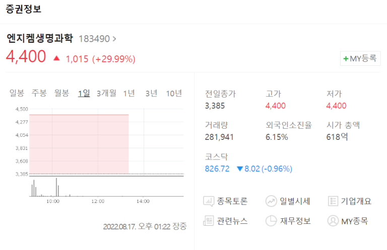 요즘 국내주식시장은 공모주도 시들한 것 같고, 주식시장도 조금씩 반등의 기미는 보이긴 하지만, 가장 큰 이슈는 아무래도 무상증자 때문이 아닐까 싶은데요. 엔지켐생명과학이 무상증자 이슈로 인해서 오늘도 주가가 상승하고 있다는 포스팅을 해 볼까요? 엔지켐생명과학 주가(캡쳐: 네이버증권) 엔지켐생명과학은 암과 염증성 질환을 가진 환자의 삶의 질 향상을 위한 혁신적인 신약 연구개발 제약 바이오기업입니다. 하지만, 요즘...