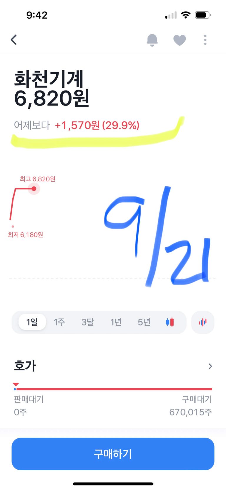 제가 우연히 주식정보를 보다가 뜬금포처럼 계속 주가가 상한가를 치는 종목이 있어 한번 슬쩍 봤는데, 그게 바로 화천기계입니다. 경영권 분쟁에 휩싸였는데 주가는 계속 상한가를 치고 있네요. 한번 살펴보겠습니다. 화천기계의 오늘 주가입니다. 오늘도 30% 상한가를 찍고 저러고 있습니다. 오늘만 +1,570원 이 올랐습니다. 구매대기도 보세요, 전부 매수하려고 난리입니다. 저도 이런 데 한번 발...