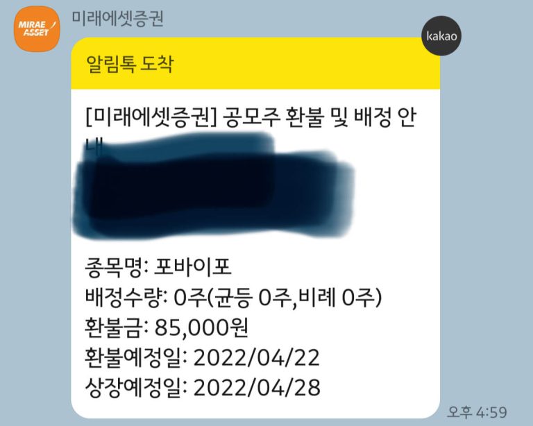 22년 최고의 수요예측결과를 남겼던 공모주 포바이포에 대한 청약배정결과가 나왔는데요, 경쟁률이 무려 3763대 1 로 올해 최고의 경쟁률일 뿐만 아니라 청약증거금이 무려 14조나 몰리는 결과를 가져왔습니다. 저는 균등 최소청약주수 10주만 신청했는데요. 저의 기대를 져버리지 않고 아래와 같은 결과를 낳았습니다. 포바이포 환불금 및 청약배정결과 안내 카톡 요즘 공모주에 대한 저의 관심도 조금은...