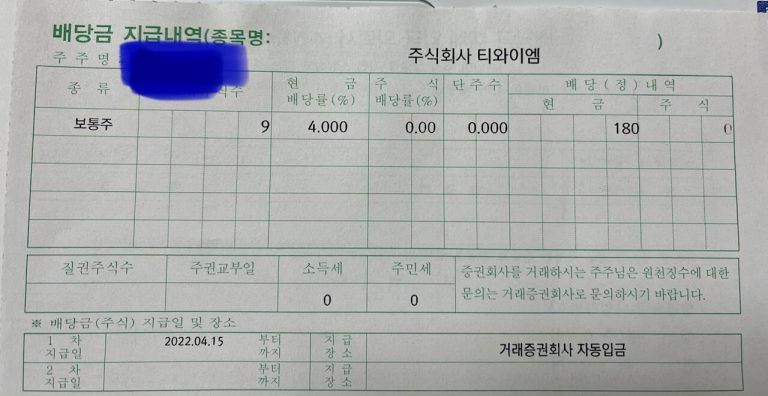 작년 연말 배당주를 뭘로 선택할까 하다가 종목을 두어개 선정하고 푼돈이 남았는데요. 그 돈으로 산 종목이 티와이엠인데요. 이게 보통주인데도, 배당금이 나왔다는 사실! 깜짝 놀랬습니다. 역시 배당금 통지서는 언제나 즐겁습니다. 티와이엠 배당금은 9주에 180원입니다. 하하하! 놀래셨죠? 그래도 만원은 넘을 줄 알았는데.. ㅋㅋㅋㅋ주가는 1~2천원대를 유지하고 있습니다. 근데 티와이엠이 배당을 주다니….아마도 1주당 20원인 듯...