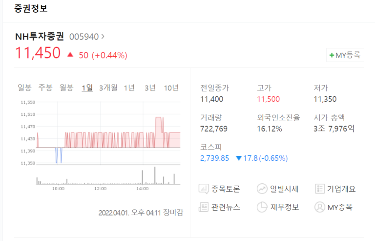 오늘은 생전 처음으로 받아본 배당(금) 통지서를 받았습니다. NH투자증권을 작년에 배당락일까지 보유했다가 매도했는데요, 과연 얼마의 배당금을 받는지, 그리고 현재 NH투자증권의 주가와 배당률도 한번 알아보겠습니다. NH투자증권 현재 주가(22년 4월 1일자) NH투자증권 현재주가(4/1) 현재 주가는 11,450원입니다. 1년 최고 주가는 13,700원이었고, 최저가는 11,100원이었습니다. 현금배당수익률은 9.21%에 해당합니다. NH투자증권 보통주 보다 우선주가 50원 더 받는다고 합니다....
