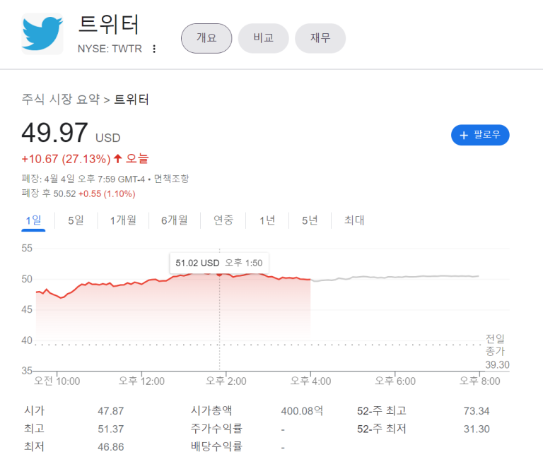 트위터 +27.1% 급등에는 일론 머스크가 있었다!