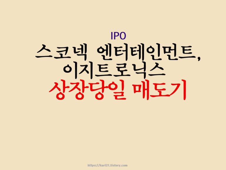 공모주 상장당일매도기 안녕하세요, 카알KaRL21입니다. 오늘은 공모주 스코텍 엔터테인먼트와 이지트로닉스가 동시에 상장하는 날 입니다. 오늘 아침 후다닥 매도한 기록을 잠깐 포스팅해 보고자 합니다. 두 종목이 동시에 상장하는 바람에 정신이 좀 없었습니다. 1. 스코넥 엔터테인먼트 매도기 스코넥 엔터테인먼트가 신영증권사 주관이라서 애로사항이 없지 않았습니다. 대형증권사가 아닌 경우에는 매매할 때 버퍼링(?)을 미리 예상해 두셔야...