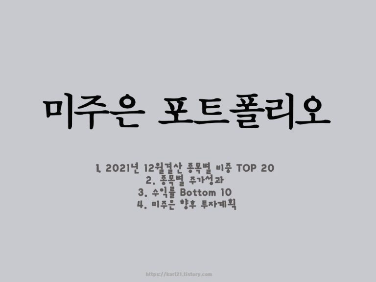 미주은 최철대표의 포트폴리오 2021년 12월이 지나고 2022년 1월에 들어서면서 유튜브 미주은 채널의 최철 대표가 자신의 포트폴리오를 공개합니다. 원래 최철 대표는 매월 초에 자신의 포트폴리오를 공개하면서 수익률 증가한 항목, 감소한 항목도 공개하고 새롭게 추가된 항목이나 삭제한 항목도 공유하는데요. 이런 솔직한 공유가 더 많은 구독자의 성원을 덧입는 것이 아닌가 생각해 봅니다. 저는...