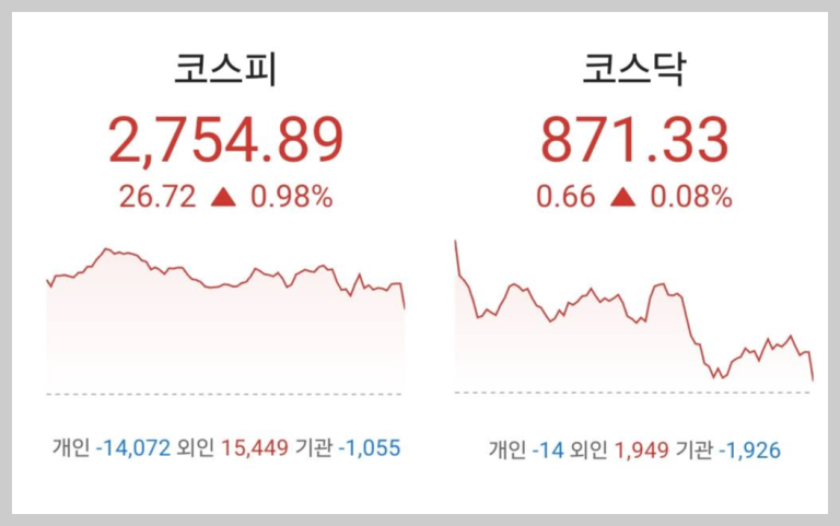 주식 시황 :: 5월 CPI 점도표 발표 (2024/06/13) 1. 코스피 – 2754.89 (+0.98%) – 개인 -14072억, 외국인 +15449억, 기관 -1055억 2. 코스닥 – 871.33 (+0.08%) – 개인 -14억, 외국인 +1949억, 기관 -1926억 금일 ISSUE 미국 5월 소비자물가지수 CPI 는 전년대비 +3.3% 로 완전히 꺽이지는 않았지만 예상치를 하회하며 S&P 500 과...