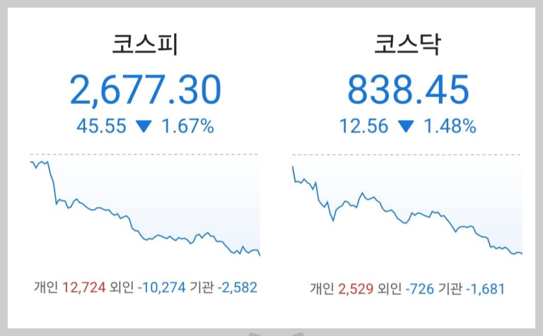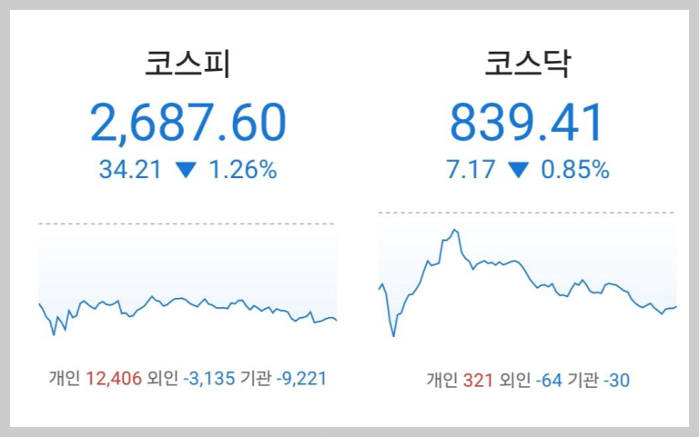 주식시황 :: 엔비디아 신고가, 10년물 국채금리 상승 (2024/05/29) 1. 코스피 – 2677.30 (-1.67%) – 개인 +12724억, 외국인 -10274억, 기관 -2582억 2. 코스닥 – 838.45 (-1.48%) – 개인 +2529억, 외국인 -726억, 기관 -1681억 삼성전자 -3% 하락 한국-UAE 300억 달러 투자 공약 3월 출생아 수 사상 처음으로 2만명 하회 금일 ISSUE 미국 주식시장은 엔비디아 신고가에 재차 갱신하며 나스닥은 17000을...