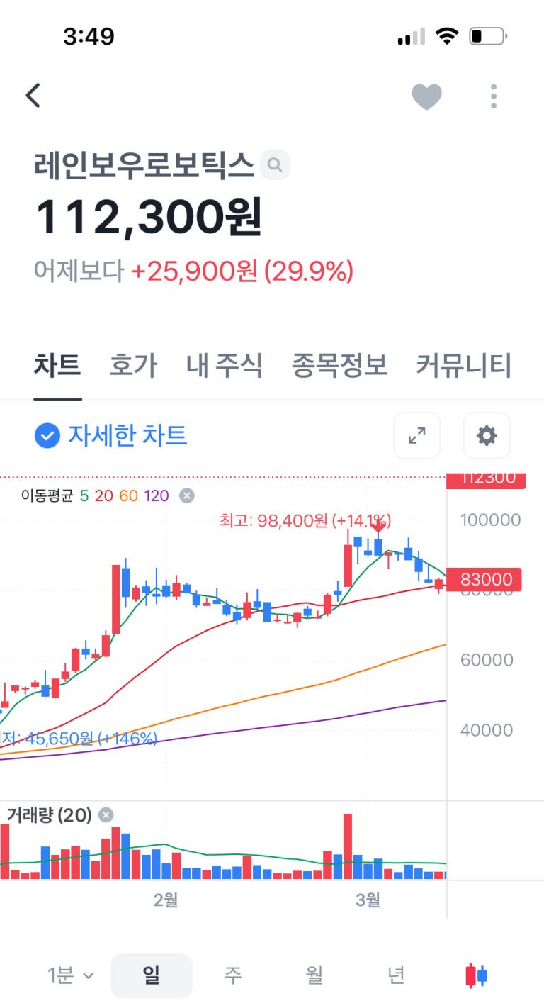 미국의 SVB파산 사태 등으로 인해 여러가지 흉흉한 소식이 가득한 상황이지만 국내증시에서 오늘 상한가 30%를 친 종목이 있는데 바로 레인보우로보틱스입니다. 오늘 29.9%를 찍었는데요. 이렇게 가파른 상승세에 삼성전자가 있습니다. 오늘 레인보우로보틱스는 어제보다 무려 +25,900원(29.9%)를 찍어버렸습니다. 오늘의 상한가를 찍어버렸네요. 미국증시와는 다르게 우리나라는 +30%라는 상한가, -30%라는 하한가의 마지노선이 있다는 것은 다들 아시죠? 더 올라갈래도...
