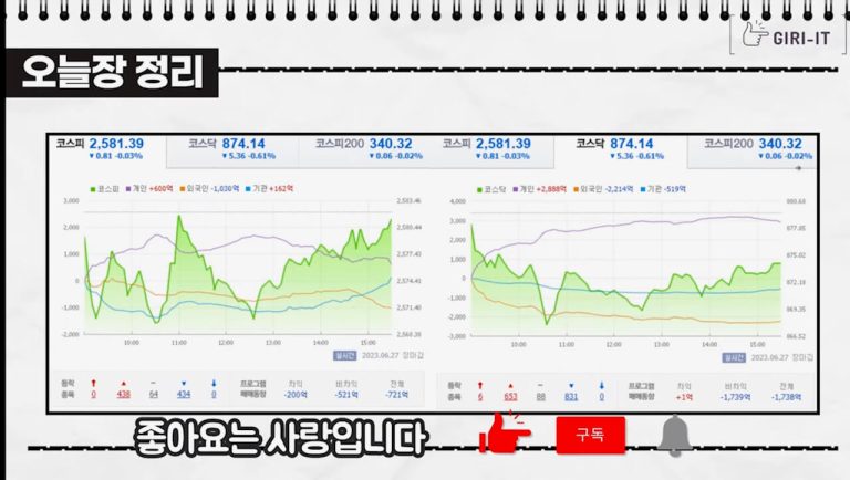 2023년 6월 27일 현재 국내시장은 마감했는데요. 주식유튜브인 ‘기릿’방송을 내용을 토대로 요약 및 정리해 보도록 하겠습니다. 오늘의 주식시장 정리 오늘은 전부 다 파란색입니다. 코스피, 코스닥, 모두 파란색이었다는 것, 한동안 좋았던 장이 엄청 빠지고 있는지, 조정중인지 암튼 그렇습니다. 오늘의 장정리(캡쳐: 기릿) 과연 코스피가 몇일 전만에도 상승중이었는데, 점점 떨어지는 것은 조정중인지 아니면 다시...