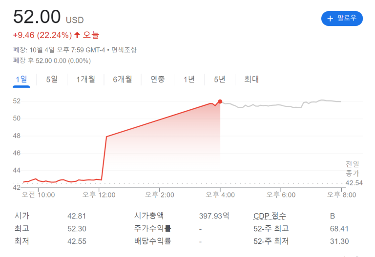 테슬라의 대장 일론 머스크가 이전에 트위터의 가짜 계정을 이유로 트위터 인수를 하지 않겠다고 7월 일방적으로 인수 중단 입장을 선언했습니다. 하지만, 머스크가 다시 트위터 인수를 추진하겠다고 밝혔고 트위터주가가 하루만에 무려 22% 올랐습니다. 2022년 10월 4일 트위터 종가 어젯밤 하루만에 무려 트위터의 주가가 22%나 상승했습니다. 현재 트위터의 주가는 52달러에 종가를 기록했습니다. 이런...